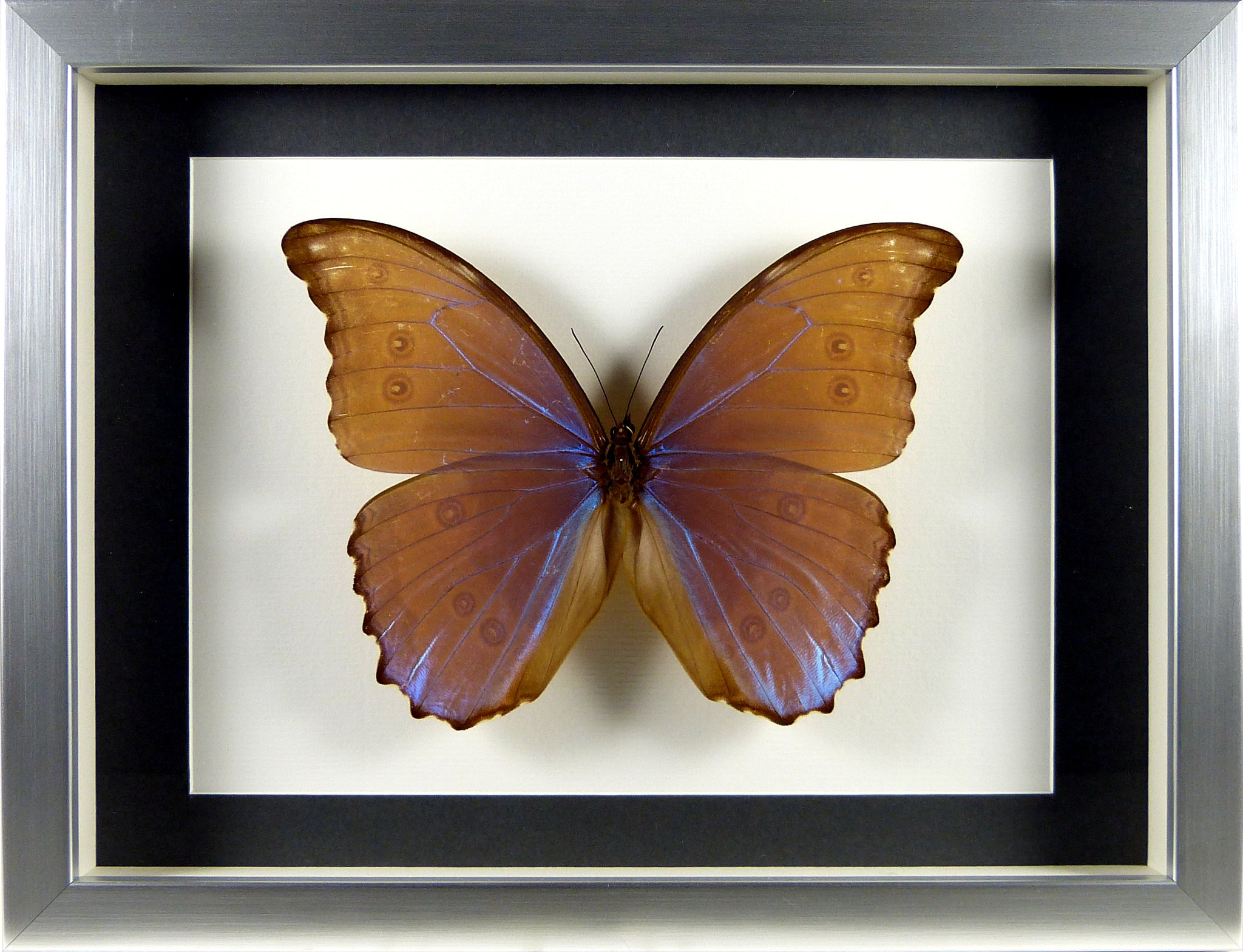 Grand papillon bleu métallique "Morpho godarti assarpai" du Pérou naturalisé et fixé dans un cadre en bois laqué ou teinté.