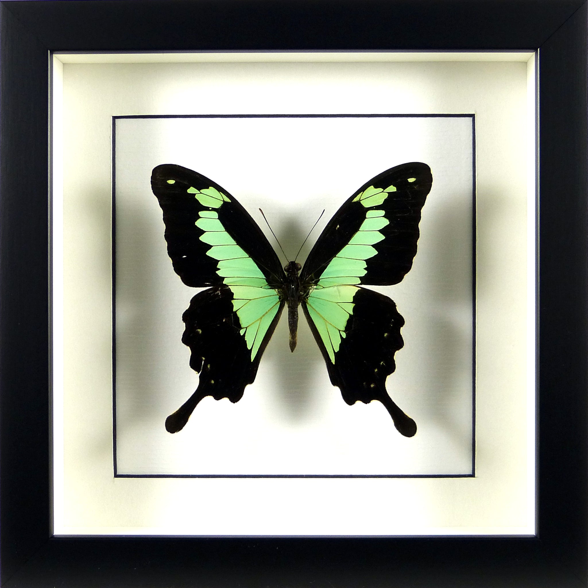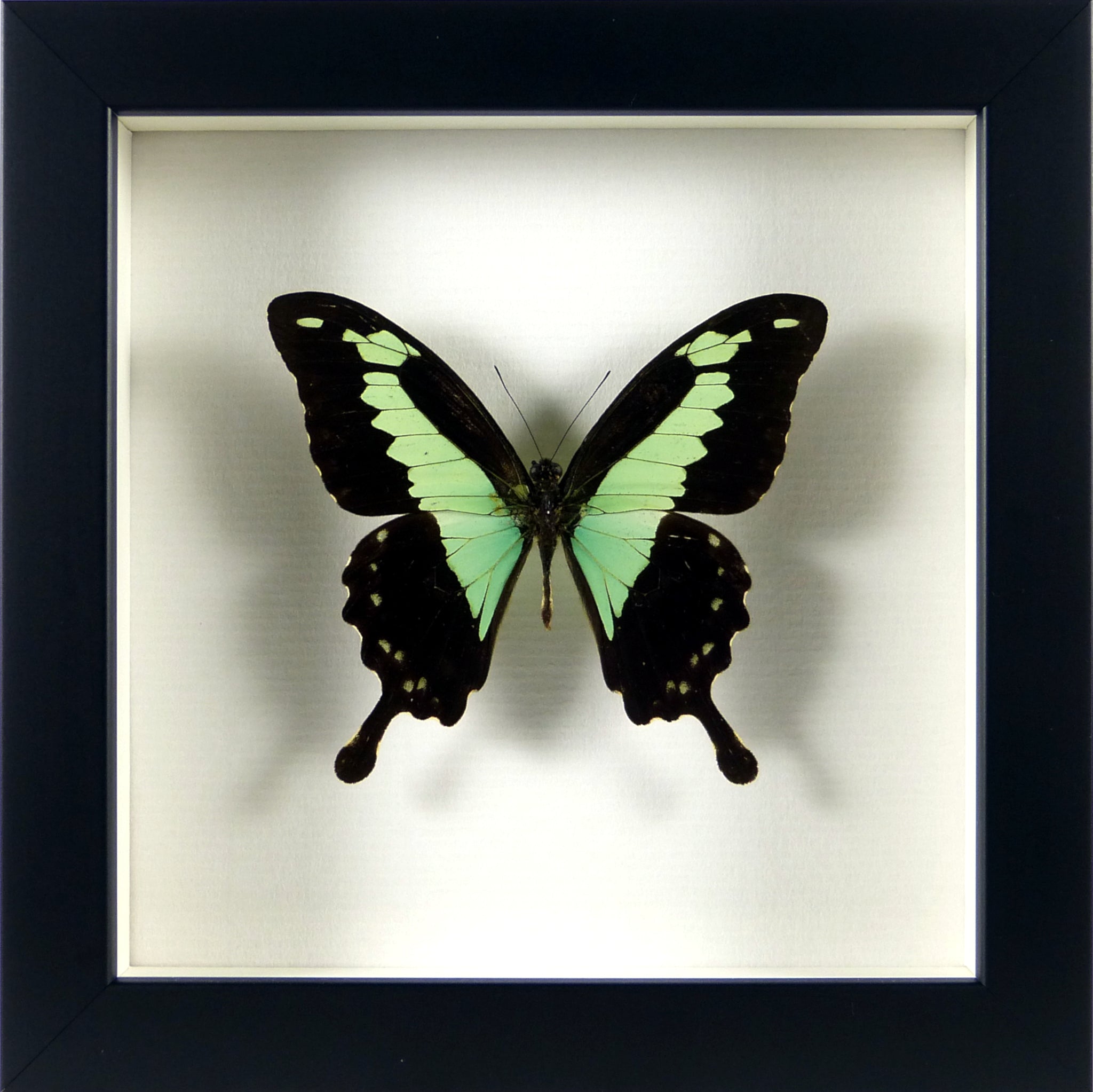 Véritable papillon noir et vert "Papilio phorcas" de Centrafrique naturalisé et fixé dans un cadre en bois.